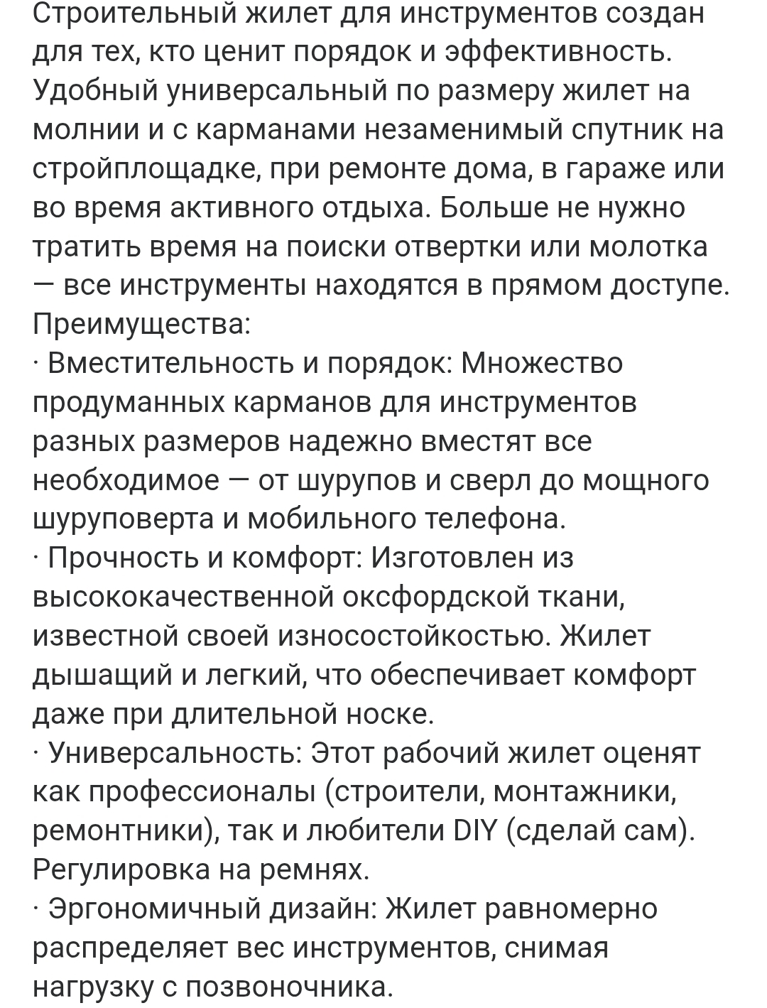 · Универсальность: Этот рабочий жилет оценят как профессионалы (строители, монтажники, ремонтники), так и любители DIY (сделай сам). Регулировка на ремнях.
